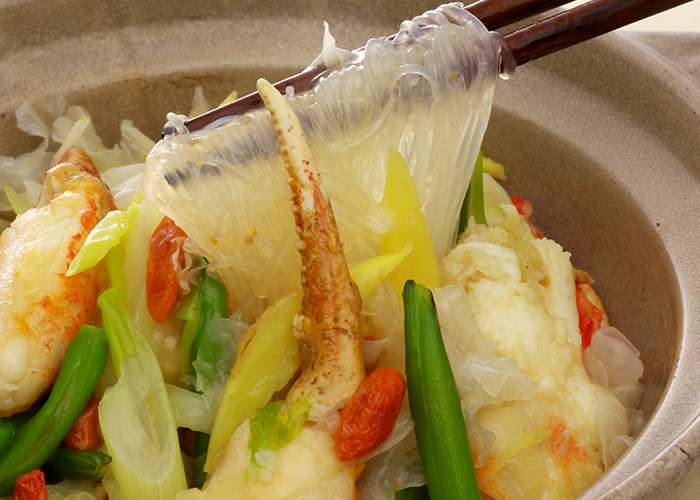| 蟹味噌とフカヒレのスープ こってりとした風味と旨みのある蟹味噌を加えたスープ。美しい肌や髪を保ちたい方に。 |
