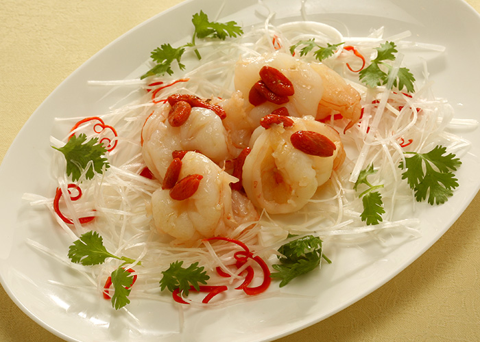 | 真珠粉入り海鮮と卵白の炒め 真珠粉入りのなめらかな卵白を海鮮と合わせた一品。美しい肌作りに最適です。 |